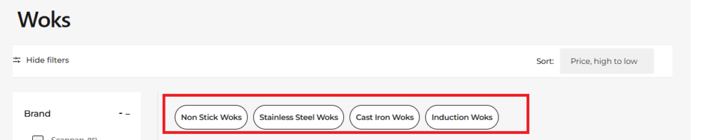 For example, a visitor browsing the Woks collection can immediately choose between Non Stick Woks, Stainless Steel Woks, Cast Iron Woks, or Induction Woks without scrolling through unrelated products. This significantly improves the browsing experience, especially for stores with large product inventories.