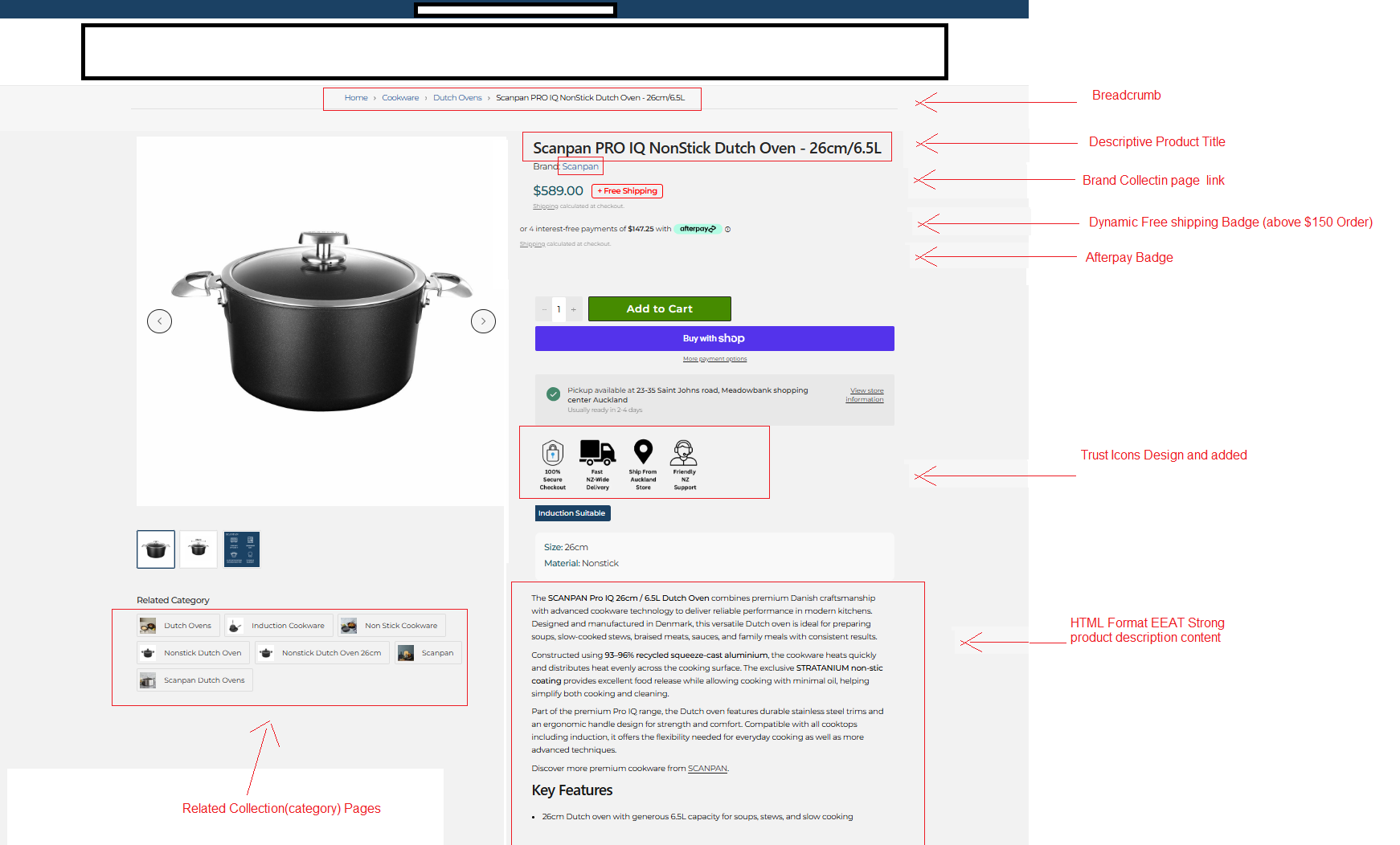 The product page was optimised to improve search engine visibility, strengthen internal linking, and enhance customer trust signals to increase conversions.
