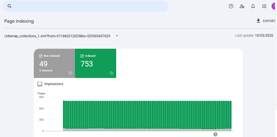 • Collection Pages: 753 out of 802 pages indexed, with 49 pages not indexed, achieving an indexing ratio of 94%.